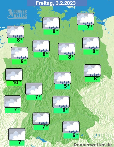 Am Freitag ziehen überwiegend dichte Wolken durch und es fällt zeitweise Regen, im Südosten und Osten hin ist hier und da auch Schneeregen oder Schnee möglich. Die Temperatur erreicht 5 Grad im Vogtland und bis 10 Grad im Rheinland.