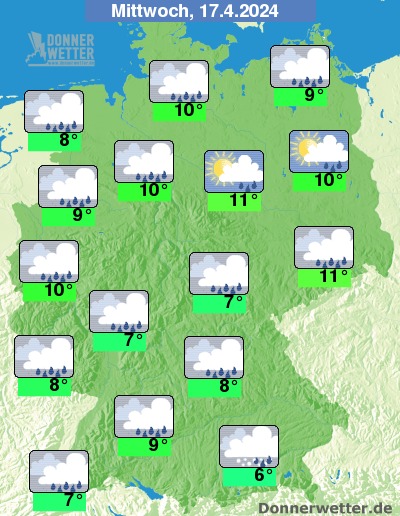 Am Mittwoch zeigt sich der Himmel überwiegend wechselnd oder stark bewölkt und es muss verbreitet mit Regen- oder Graupelschauern gerechnet werden; in den höheren Lagen Schnee. Auch lokale Gewitter können zur Wochenmitte vor allem in der Süd- und Westhälfte nicht ausgeschlossen werden.