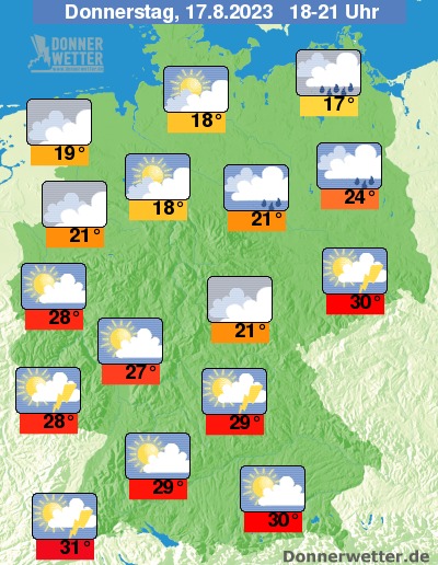 Heute Abend bilden sich bei vielerorts kompakte Wolken vor allem im Süden und Osten gebietsweise Schauer sowie örtlich auch Gewitter. Im übrigen Bundesgebiet ist es teils heiter, teils zieht auch starke Bewölkung durch, dabei ist das Schauer- und Gewitterrisiko meist nur leicht, hier und da auch mäßig. Die Temperatur liegt bei 17 Grad in Stralsund und bis 31 Grad in Freiburg.
