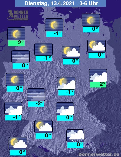 In der folgenden Nacht zeigt sich der Himmel über der Nordwesthälfte Deutschlands meist sternenklar. Weiter nach Südosten hin ist der Himmel hingegen meist dicht bewölkt und im Südosten fällt auch Schnee, Schneeregen oder Regen, sonst bleibt es trocken. Die Temperatur sinkt auf 2 Grad an der Nordsee und bis -2 Grad am Taunus.