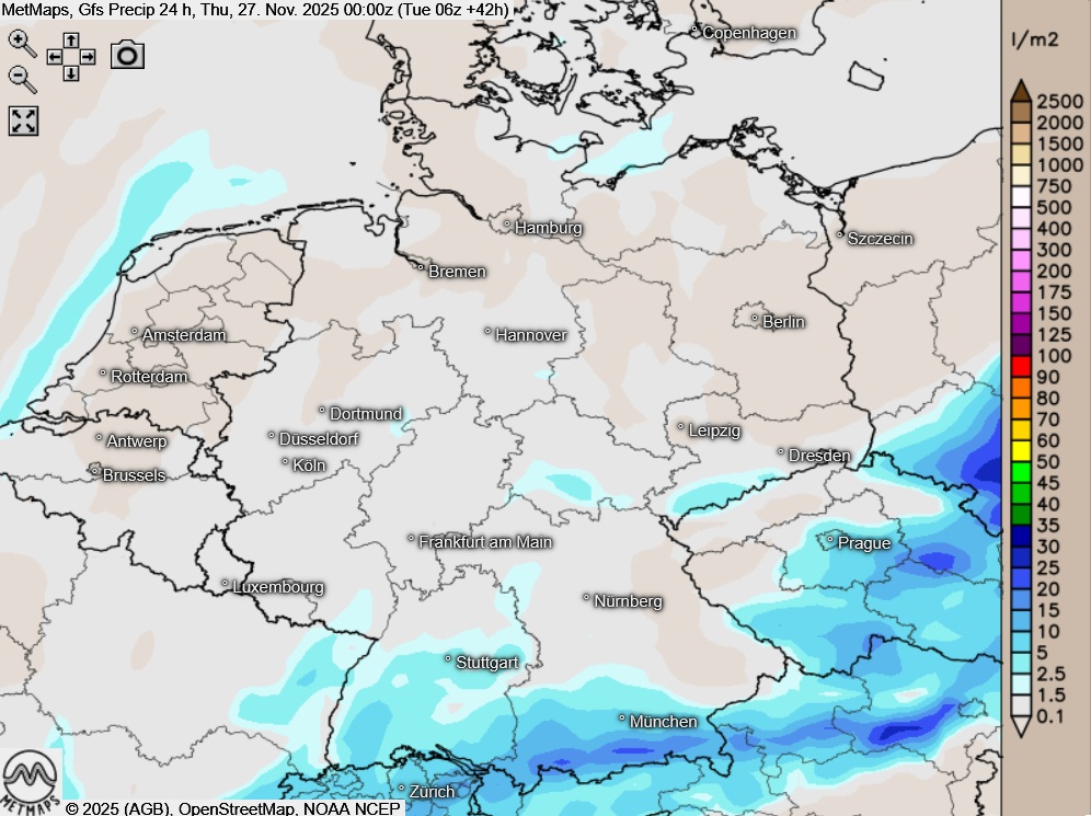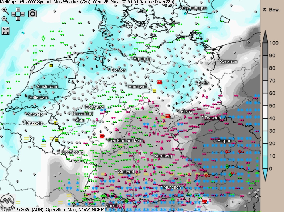 Die Wetter- und Temperaturkarte für Mittwochfrüh sowie die 24-Stunden-Regenmengen am Mittwoch nach GFS: