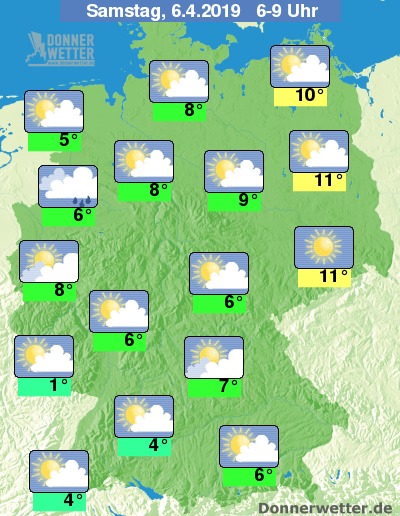 Die Temperaturen liegen in den Frühstunden bei Werten um 1 Grad C im Pfälzer Wald und bereits sehr milden 11 Grad C in der Lausitz.