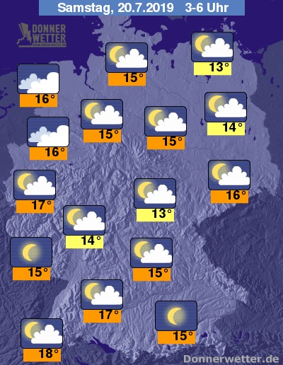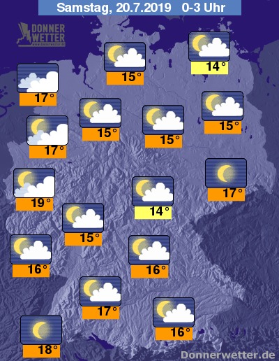 In der Nacht zeigt sich der Himmel über weiten Landesteilen locker bewölkt, im Nordwesten Deutschlands können die Wolken auch dichter sein. Ein ungestörter Blick in die Sterne gelingt in den Nachtstunden regional im Südwesten, der Lausitz sowie am Alpenrand. Es bleibt trocken.