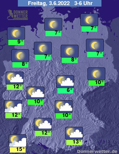 Die Temperaturen fallen auf Werte um 15 Grad im Breisgau und 6 Grad im Thüringer Becken.