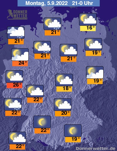 Die Temperaturen gehen bis Mitternacht auf Werte um 26 Grad in der Kölner Bucht und 16 Grad an der Ostseeküste zurück.