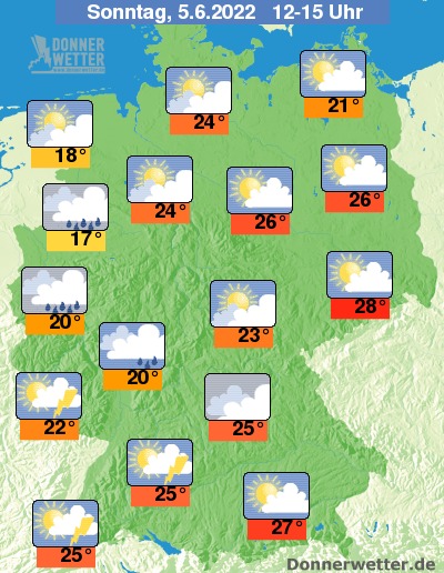 In den Nachmittagsstunden breiten sich von Südwesten zunehmend dichte Wolken und kräftige Schauer und Gewitter landeinwärts aus. Dabei besteht lokal besteht ein erhöhtes Unwetterrisiko durch Starkregen, im Alpenvorland auch durch großkörnigen Hagel und schweren Sturmböen. Trocken und bei einem Mix aus Sonne und Wolken freundlich bleibt der Sonntagnachmittag im äußersten Osten und Nordosten des Landes.