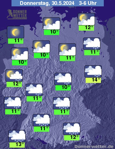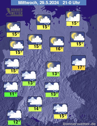 In den Nachmittagsstunden zeigt sich der Himmel verbreitet stark bewölkt oder bedeckt, dabei erreichen Regengebiete auch die südöstlichen Landesteile. Im Nordwesten und der Mitte fallen die Niederschläge dann zumeist als Schauer, lokal sind auch kräftige Gewitter möglich.