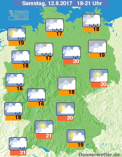 Heute Abend ist es zumeist stark, vor allem im Süden und über Sachsen auch häufig locker bis aufgelockert bewölkt, hier bleibt es auch mehrheitlich trocken, sonst fällt hingegen zeitweise Regen. Die Temperatur liegt bei 16 Grad am Taunus und bis 21 Grad in Stuttgart.