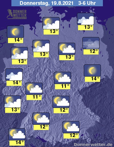 In der Nacht zum Donnerstag ist der Himmel überwiegend locker bewölkt oder sogar sternenklar. Gegen Morgen können hier und da mehr Wolken durchziehen, dazu bleibt es aber trocken. Die Temperatur sinkt auf 14 Grad im Rheinland und etwa 11 Grad im Vogtland.