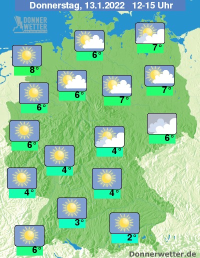 Heute Nachmittag ist es vor allem über der Südwesthälfte des Landes oft heiter bis sonnig, sonst ist es aber auch gebietsweise stark bewölkt oder neblig-trüb, es bleibt landesweit trocken. Die Temperatur liegt bei 2 Grad im Berchtesgadener Land und bis 8 Grad an der Nordsee.