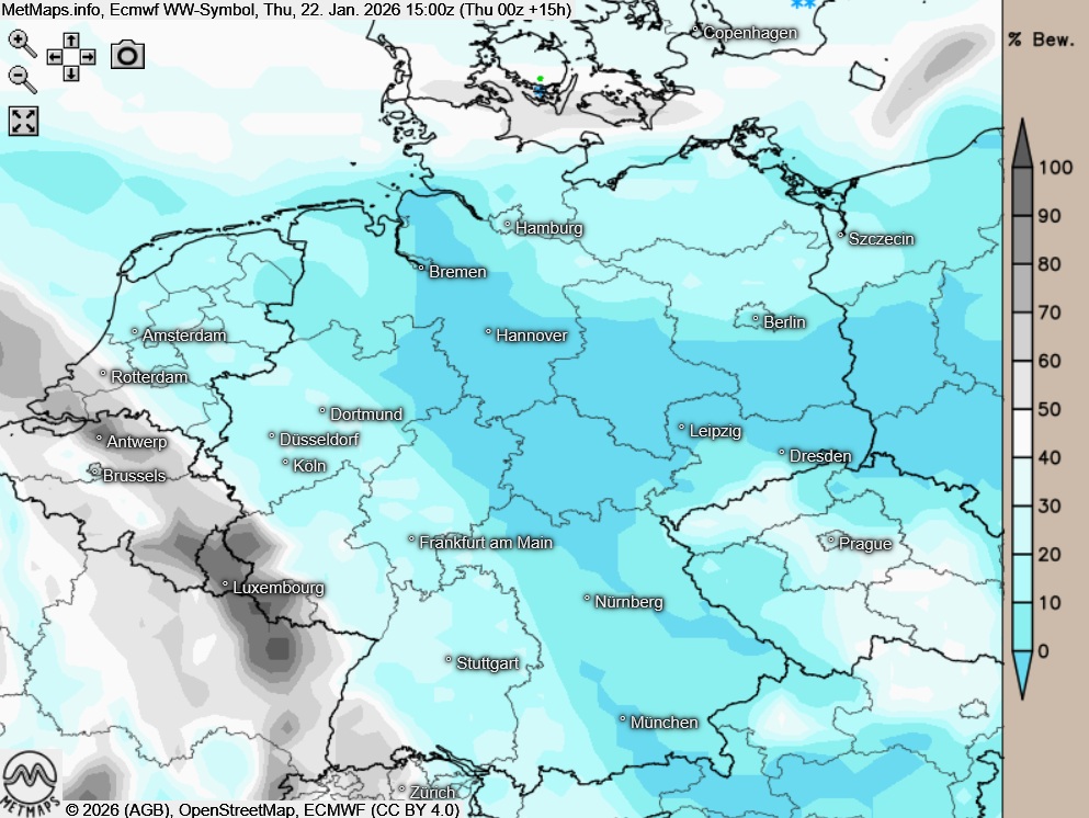 Am Donnerstagnachmittag zeigt sich der Himmel über dem äußersten Norden bedeckt, lokal kann dabei etwas Sprühregen fallen. Von Westen und Südwesten können am Nachmittag zeitweise Wolken durchziehen; im Südwesten sowie im äußersten Süden und Südosten hält sich teils auch hochnebelartige Bewölkung. Sonst scheint die Sonne verbreitet von einem wolkenlosen Himmel.