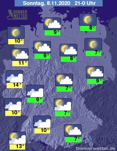 Die Temperaturen sinken am späten Abend auf Werte um 14 Grad im Rheinland und 7 Grad an der Spree.