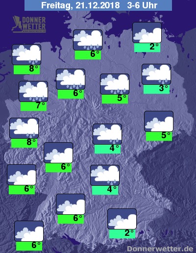 In der Nacht zeigt sich der Himmel über weiten Teilen des Landes dicht bewölkt oder bedeckt, einzelne Wolkenlücken beschränken sich auf Teile Brandenburgs und Teile Süddeutschlands. Vor allem im Norden des Landes muss zum Teil mit kräftigem Regen gerechnet werden, im Süden bleibt es weitgehend trocken.