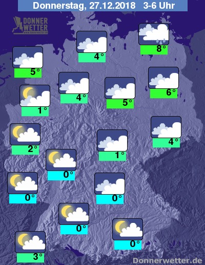 Der Donnerstag zeigt viele Aufheiterungen die die Sonne auch mal durchlassen. Niederschläge sind an der Ostseeküste und im Erzgebirge zu erwarten. Die Tageshöchsttemperaturen sind 7 Grad C in Berlin und 9 Grad C im Schwarzwald.