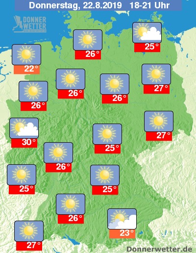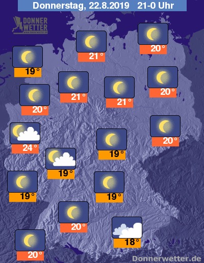 Bis zu ihrem Untergang scheint die Sonne am Donnerstagabend von einem meist wolkenlosen Himmel. Einzelne harmlose Quellbewölkung gibt es am Abend in der Westhälfte sowie an der Ostseeküste; am Alpenrand können die Wolken zeitweise auch mal dichter sein. Schauer sind aber nicht zu erwarten.