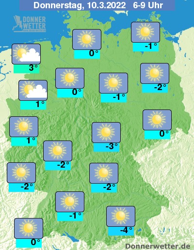 Der Donnerstag startet bis auf lockere Quellbewölkung im Nordwesten mit viel Sonnenschein. Bei Temperaturen um -4 bis 3 Grad bleibt es trocken.