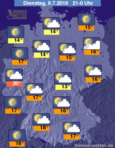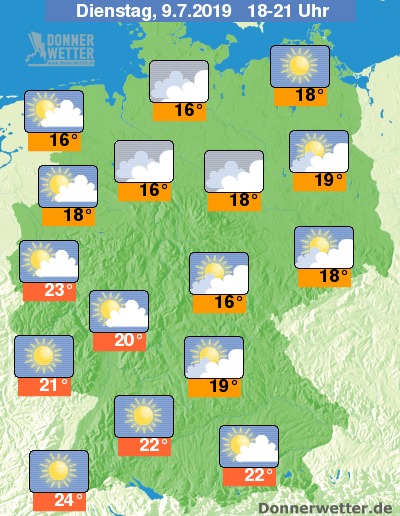Die Temperaturen liegen am frühen Abend meist zwischen 15 und 20 Grad, im Süden und Südwesten zwischen 20 und 24 Grad.