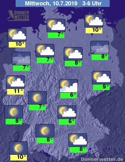 Bis zu den Frühstunden kühlt die Luft auf 6 bis 11 Grad ab. In einigen Mittelgebirgstälern und in geschützten Lagen kann es noch kälter werden.