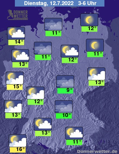 In der Nacht zum Dienstag halten sich in den westlichen Landesteilen oft einige, teils auch dichte Wolken. Weiter nach Osten hin ist es hingegen meist sternenklar oder nur gering bewölkt. Es bleibt landesweit trocken bei Tiefstwerten von 16 Grad im Breisgau und 9 Grad im Grabfeld.