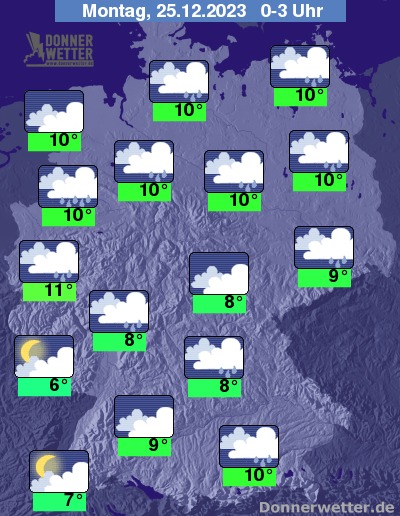 Am Sonntagabend und in der Nacht auf Montag bleibt der Himmel stark bewölkt oder es ist bedeckt, dabei muss in weiten Landesteilen mit Niederschlägen gerechnet werden; im Südwesten sowie später in der Mitte gibt es im Verlauf auch längere Zeit mal  Regenpausen. Es weht weiterhin ein teils stürmischer Wind.