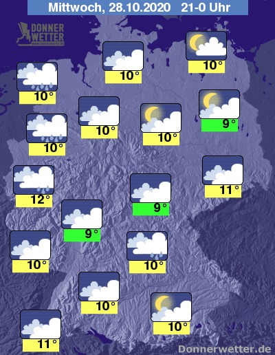Bis Mitternacht verstärkt sich der Regen im Nordwesten, in den übrigen Landesteilen dominieren zwar die Wolken aber nur vereinzelt tröpfelt es etwas. Nach Osten hin zeigen sich teilweise die Sterne.