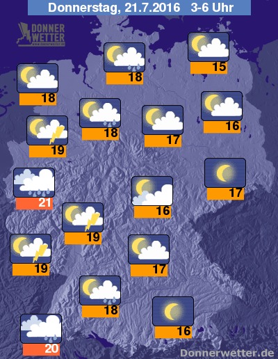In der bevorstehenden Nacht bleibt es in der Osthälfte bis zum Morgen noch meist leicht oder aufgelockert bewölkt und trocken. Weiter nach Westen hin zieht hingegen oft starke Bewölkung durch und es können sich verbreitet Schauer und gebietsweise Gewitter entwickeln. Die Temperatur sinkt auf tropische 21 Grad in Aachen und etwa 15 Grad an der Müritz.