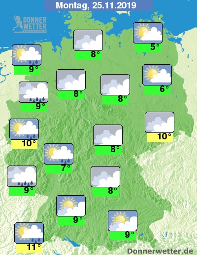Am Montag ist es größtenteils stark bewölkt oder trüb, hier und da zeigen sich mögliche Auflockerungen. Es bleibt zunächst noch landesweit trocken, bevor ab dem Nachmittag westlich des Rheins Regen aufziehen kann. Die Temperatur steigt auf 5 Grad auf Rügen und bis 11 Grad im Oberrheingraben.