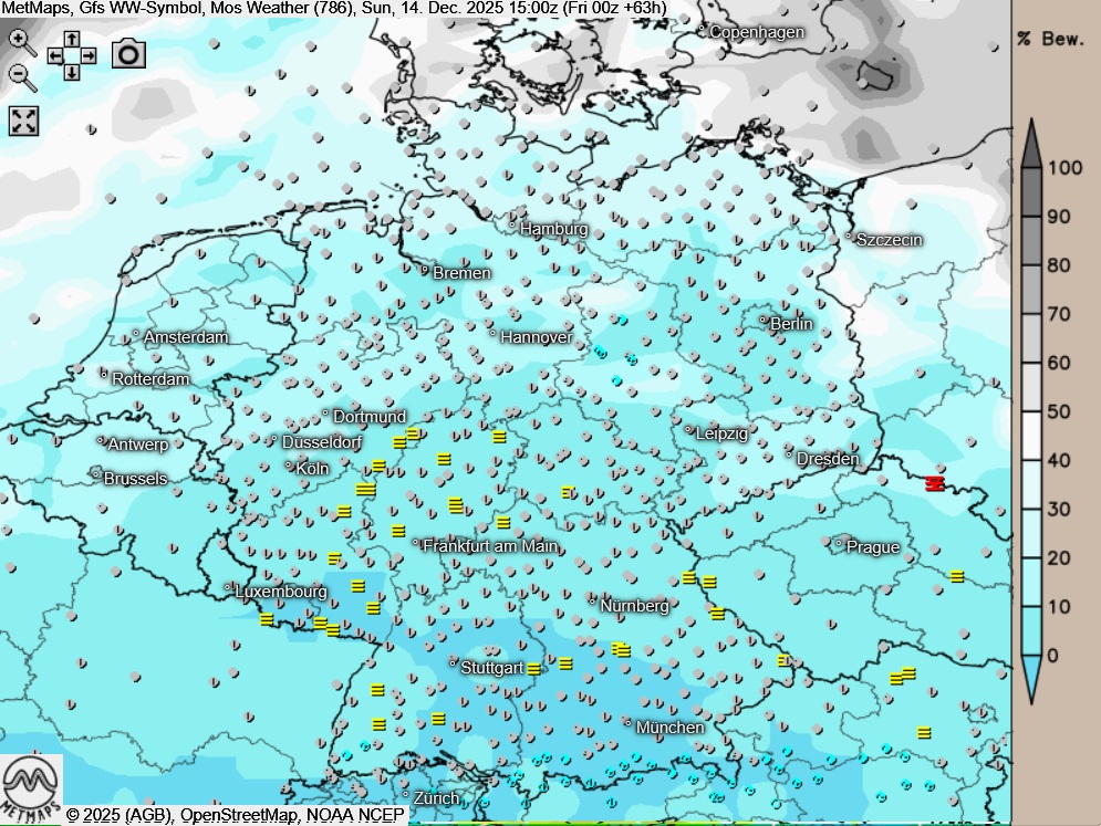 Die Temperaturen erreichen im Dauernebel Höchstwerte um 2 Grad, sonst 6 bis 11 Grad.