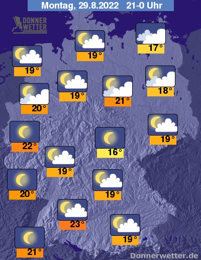 Die Temperaturen gehen bis Mitternacht auf Werte um 23 Grad auf der Schwäbischen Alb und 17 Grd an der Ostseeküste zurück.