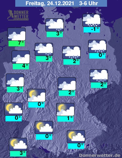 In der Nacht zum Freitag ist der Himmel im Süden meist locker bis aufgelockert, teils auch stark bewölkt, dazu bleibt es hier trocken. Über der Nordosthälfte des Landes ist es bedeckt und es fällt zeitweise Regen, Schneeregen oder Schnee, dazu besteht erhöhte Glättegefahr! Im übrigen Land bleibt es bei weitgehend dichter Bewölkung trocken. Die Temperatur sinkt auf 7 Grad in Cuxhaven und bis -1 Grad in Stralsund.