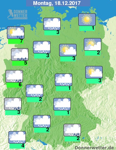 Über der Mitte und im Südwesten fällt zunächst zeitweise Schnee, an Mosel und Saar auch leichter Regen oder Sprühregen. Es muss verbreitet mit Verkehrsbehinderungen gerechnet werden. Zum Nachmittag zieht sich das Niederschlagsgebiet unter Abschwächung Richtung Schweiz und Elsass zurück. Sonst präsentiert sich der Himmel über Deutschland teils wolkenverhangen teils aufgelockert. Vor allem im Nordosten scheint auch zeitweise die Sonne. Die Tageshöchsttemperaturen liegen zwischen 0 und 3 Grad. An Saar, Mosel und Niederrhein können auch 4 bis 7 Grad erreicht werden. Im Emsland sind bis zu 8 Grad möglich. Im Bergland bleibt es bei leichtem Dauerfrost. Der Wind weht meist nur schwach.