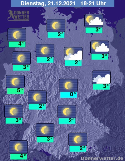 Heute Abend zeigt sich der Himmel über dem Land größtenteils sternenklar. Im Osten und Nordosten hält sich hingegen auch oft dichte Bewölkung, Auflockerungen bleiben dazu eher selten, hier und da sind einige Flocken oder Tropfen möglich, im übrigen Land bleibt es aber trocken. Die Temperatur liegt bei 0 Grad in Erfurt und bis 5 Grad in Köln.
