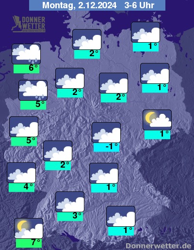 In der Nacht zum Montag ist es teils nebelig oder hochnebelartig bewölkt, teils aufgelockert bewölkt oder klar. Von Westen und Nordwesten nimmt die Bewölkung im Nachtverlauf weiter zu, in den frühen Morgenstunden setzt dann auch Regen ein. In den Übergangsbereichen zu den Frostgebieten besteht Glättegefahr.