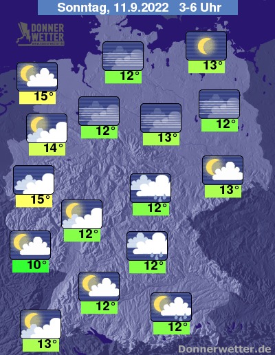 In der Nacht zum Sonntag klingen die Schauer in weiten Landesteilen rasch ab. Von Bayern bis nach Thüringen bleibt der Himmel jedoch überwiegend bedeckt und es bilden sich hier bis zum Morgen weiterhin Schauer. Im Norden klart der Himmel verbreitet auf, sonst ist es oft locker, teils auch stärker bewölkt. Die Temperatur sinkt auf 15 Grad in Cuxhaven und bis 10 Grad in Saarbrücken.