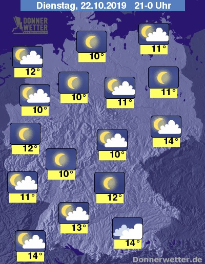 Die Temperaturen liegen vor Dämmerungsbeginn noch zwischen 14 und 20 Grad. Am wärmsten bleibt es dabei im Osten und Süden.