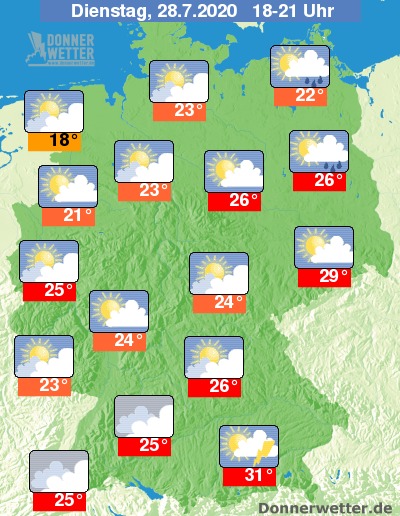 Die Temperaturen sinken am späteren Abend auf Werte um 23 Grad in Dresden und 16 Grad an der Nordseeküste ab.
