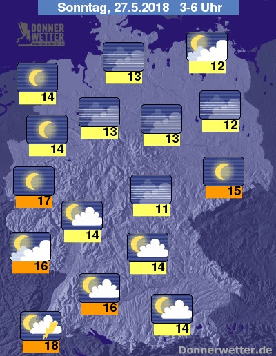 In der Nacht zum Sonntag ziehen im Süden meist lockere, teils auch mal mehr Wolken durch, dabei sind im äußersten Süden lokal auch Schauer oder Gewitter möglich. Im übrigen Bundesgebiet zeigt sich der Himmel meist sternenklar, dazu bleibt es trocken. Die Temperatur sinkt auf 18 Grad in Freiburg und bis 11 Grad im Thüringer Becken.