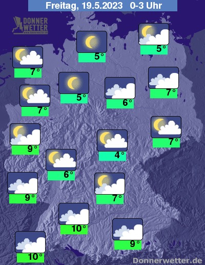 In der Nacht auf Freitag zeigt sich der Himmel vor allem im Norden und der Landesmitte nur gering bewölkt, teils ist es auch sternenklar; sonst dominiert ein Mix aus wechselnder bis aufgelockerter, über dem Südwesten und Osten auch starker Bewölkung. Es bleibt aber trocken.
