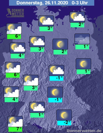 Bis zu den Frühstunden kühlt die Luft verbreitet auf 4 bis 1 Grad ab und es muss mit Reifglätte gerechnet werden, im Alpenvorland gibt es verbreitet leichten Frost bis -2 Grad. Am mildesten bleibt es im Breisgau sowie im Emsland mit Werten zwsichen 5 und 8 Grad.
