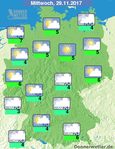 Am Mittwoch zeigt sich besonders im Osten, aber auch über der übrigen breiten Landesmitte die Sonne häufig und hier bleibt es auch weitgehend trocken. Dichte Wolken halten sich dagegen im Süden, Südwesten und auch in Küstennähe, dazu fällt hier gebietsweise Regen, Schneeregen oder Schnee. Die Temperatur erreicht nur noch 3 bis 7 Grad.