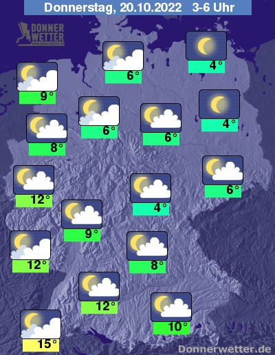 In der bevorstehenden Nacht ist der Himmel im Nordosten oft sternenklar. Im übrigen Land ist es oft locker bewölkt und gebietsweise auch aufgelockert bewölkt, dazu bleibt es trocken. Stellenweise kann sich Nebel bilden. Die Temperatur sinkt auf 15 Grad in Freiburg und bis 4 Grad in Berlin.