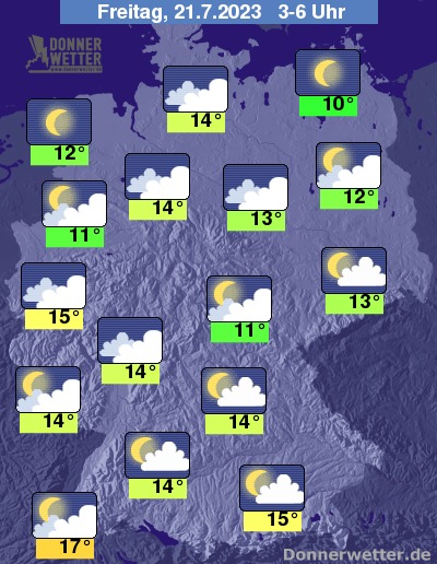 In der bevorstehenden Nacht ist der Himmel meist locker bis aufgelockert bewölkt, im Norden klart es im Verlauf meist auf. Im Süden können zeitweise dichte Wolken auch einzelne Schauer bringen, sonst bleibt es aber weitgehend trocken. Die Temperatur sinkt auf 17 Grad in Freiburg und bis 10 Grad in Neubrandenburg.