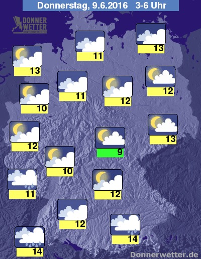 In der kommenden Nacht bleibt es im Süden meist stark bewölkt, dabei bilden sich hier gebietsweise Schauer, hier und da sind auch Gewitter möglich. Von der breiten Mitte bis nach Norddeutschland ist es meist leicht oder aufgelockert, vor allem im Norden gebietsweise aber auch stark bewölkt, dazu bleibt es aber trocken. Die Temperatur sinkt auf 14 Grad in Augsburg und bis 9 Grad im Eichsfeld.