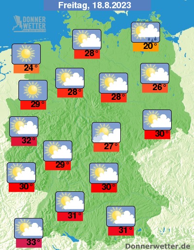 Am Freitag zeigt sich das Wetter zum Großteil heiter oder sonnig, im Tagesverlauf können jedoch örtlich einige Quellwolken durchziehen. Es besteht aber nur ein leichtes Schauer- und Gewitterrisiko. Die Temperatur steigt auf 20 Grad auf Rügen und bis 33 Grad am Oberrhein.