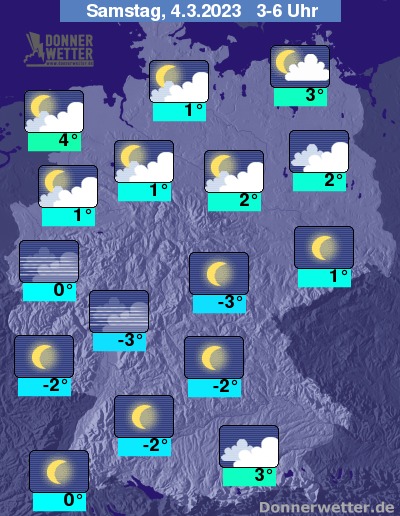 In der kommenden Nacht zieht sich der Himmel über dem Norden Deutschlands oft zu oder es ist noch aufgelockert bewölkt, dazu bleibt es weitgehend trocken. Im übrigen Bundesgebiet ist es verbreitet sternenklar, an den Alpen auch zum Teil stärker bewölkt, jedoch trocken. Die Temperatur sinkt auf 4 Grad in Cuxhaven und -3 Grad in Jena.