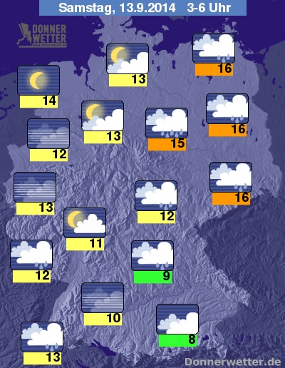 In der kommenden Nacht halten sich vor allem im Osten, häufig aber auch noch im Süden dichte Wolken, dazu fällt besonders von Sachsen bis ins südliche Brandenburg teilweise kräftiger und gewittriger Regen, im Süden fällt anfangs noch zeitweise Regen, er lässt insgesamt aber meist etwas nach, es bildet sich häufig Nebel oder Hochnebel. Von Schleswig-Holstein, über Niedersachsen, bis nach NRW bleibt es locker bewölkt oder klar und trocken, es bildet sich jedoch stellenweise Nebel. Die Temperatur sinkt auf 16 Grad in Rostock und etwa 8 Grad in Landshut.