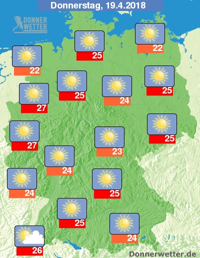 Am Donnerstag strahlt die Sonne von einem stahlblauen Himmel, harmlose Wolkenfelder sind im Südwesten möglich, dabei bleibt es trocken. Die Temperatur steigt auf 22 Grad an der See und bis auf sommerliche 27 Grad am Niederrhein.