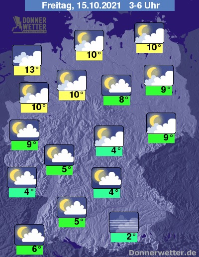 In der folgenden Nacht ist es über dem Süden meist locker bewölkt, teils auch sternenklar. Über dem übrigen Bundesgebiet ist es aufgelockert oder stark bewölkt. Es bleibt landesweit trocken bei Tiefstwerten von 13 Grad an der Nordsee und bis 2 Grad im Berchtesgadener Land.