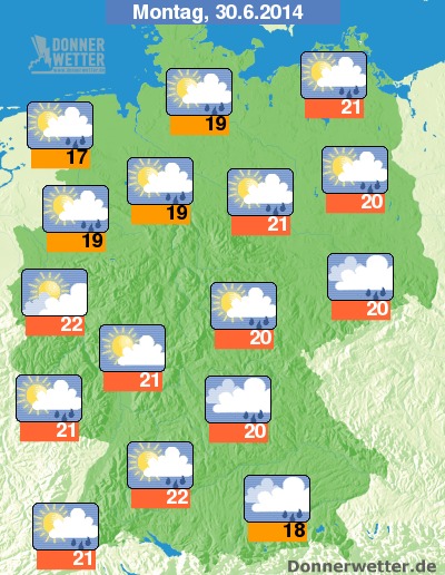 Am Montag ist es meist sehr wechselhaft und zwischen teils sonnigen Abschnitten ziehen auch immer wieder dichte Wolken mit Schauern und auch einzelnen Gewittern. Die Höchstwerte erreichen wenig sommerliche 17 Grad an der Nordseeküste und 22 Grad in Köln und Karlsruhe.