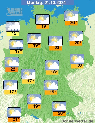 Am Montag ziehen im Nordwesten dichte Wolken durch und hier fällt gebietsweise Regen. Im Süden ist es verbreitet heiter, sonst überwiegend wechselnd bis stark bewölkt, dabei bleibt es trocken. Die Temperatur erreicht 15 Grad in Wilhelmshaven und bis 22 Grad in der Kölner Bucht.